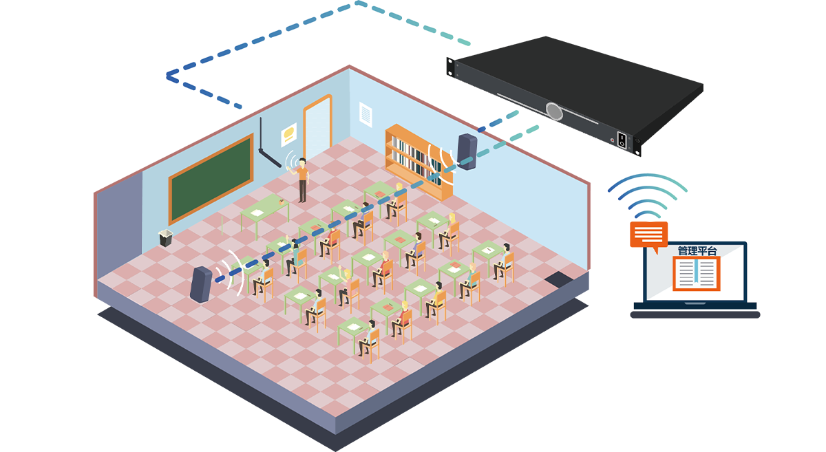 一臺處理器、一支吊麥、四只音箱,即可完善整個教室的拾音、擴(kuò)音的系統(tǒng)搭建;一個管理平臺,可視化掌控校園各間教室高清語音主機(jī)運行狀況。